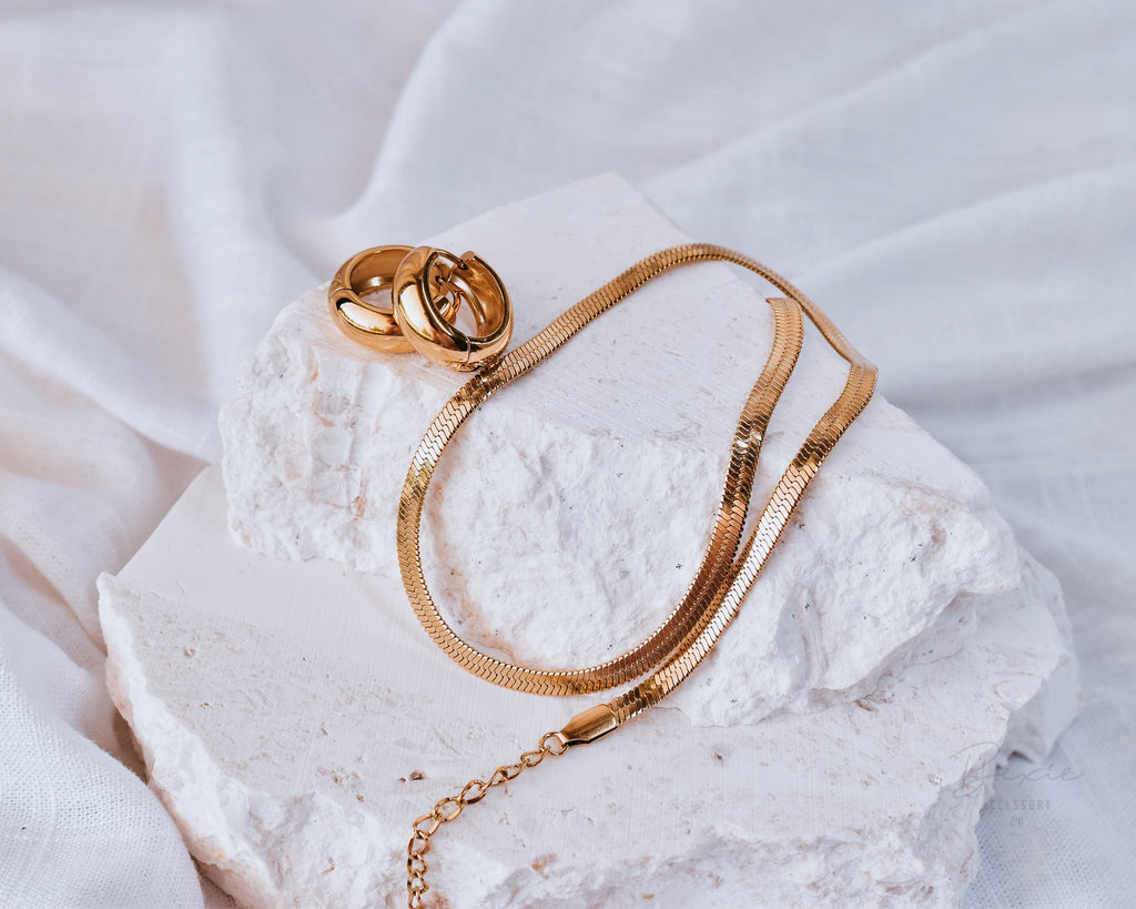 Our jewellery is crafted from surgical stainless steel, making it waterproof, tarnish proof and safe for sensitive skin. Gold jewellery is PVD plated in long-lasting 18k gold, while silver jewellery is highly polished surgical steel. (*Please note, our silver steel jewellery is naturally a darker tone than sterling silver, however, unlike sterling silver, it will not tarnish or darken further over time).