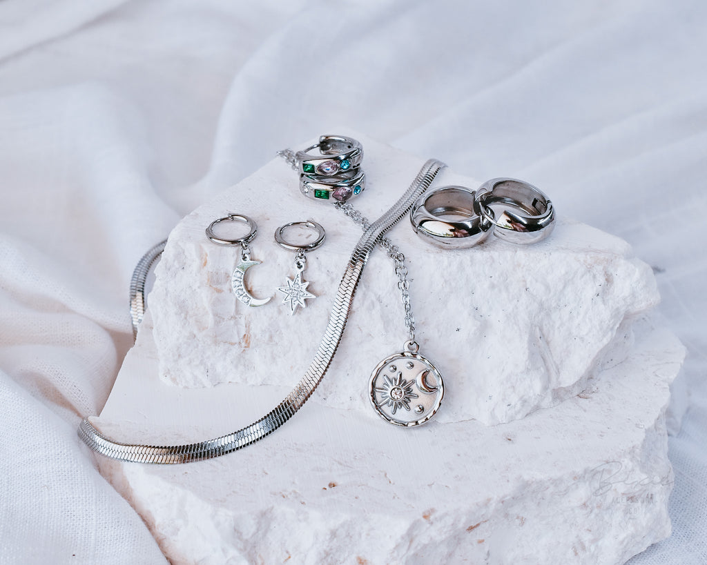 Our jewellery is crafted from surgical stainless steel, making it waterproof, tarnish proof and safe for sensitive skin. Gold jewellery is PVD plated in long-lasting 18k gold, while silver jewellery is highly polished surgical steel. (*Please note, our silver steel jewellery is naturally a darker tone than sterling silver, however, unlike sterling silver, it will not tarnish or darken further over time).
