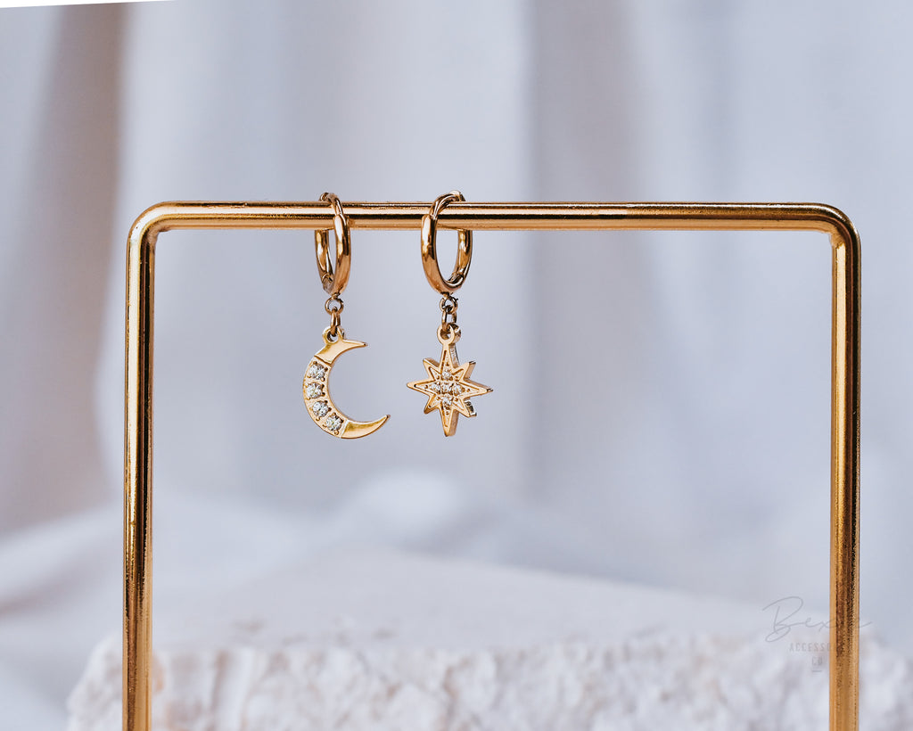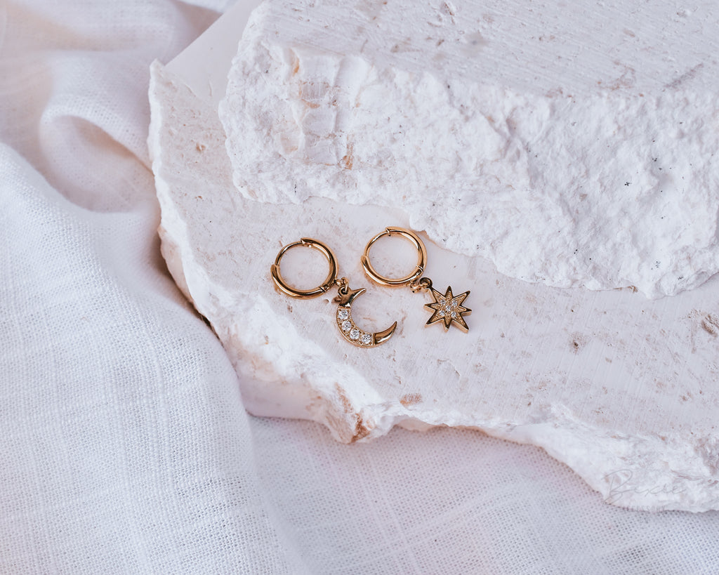 - Mismatched Moon & Star charms studded with a tiny clear Zircon stones
