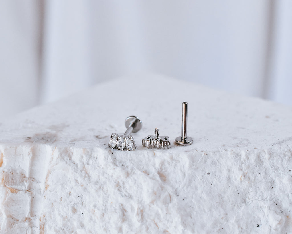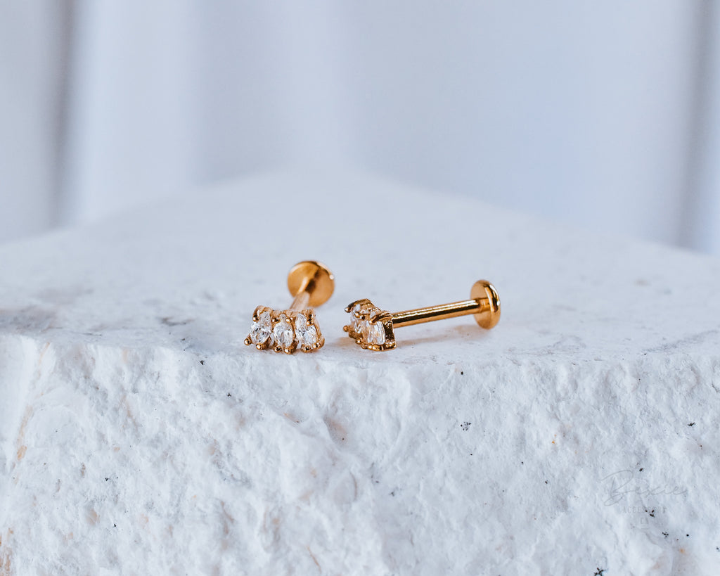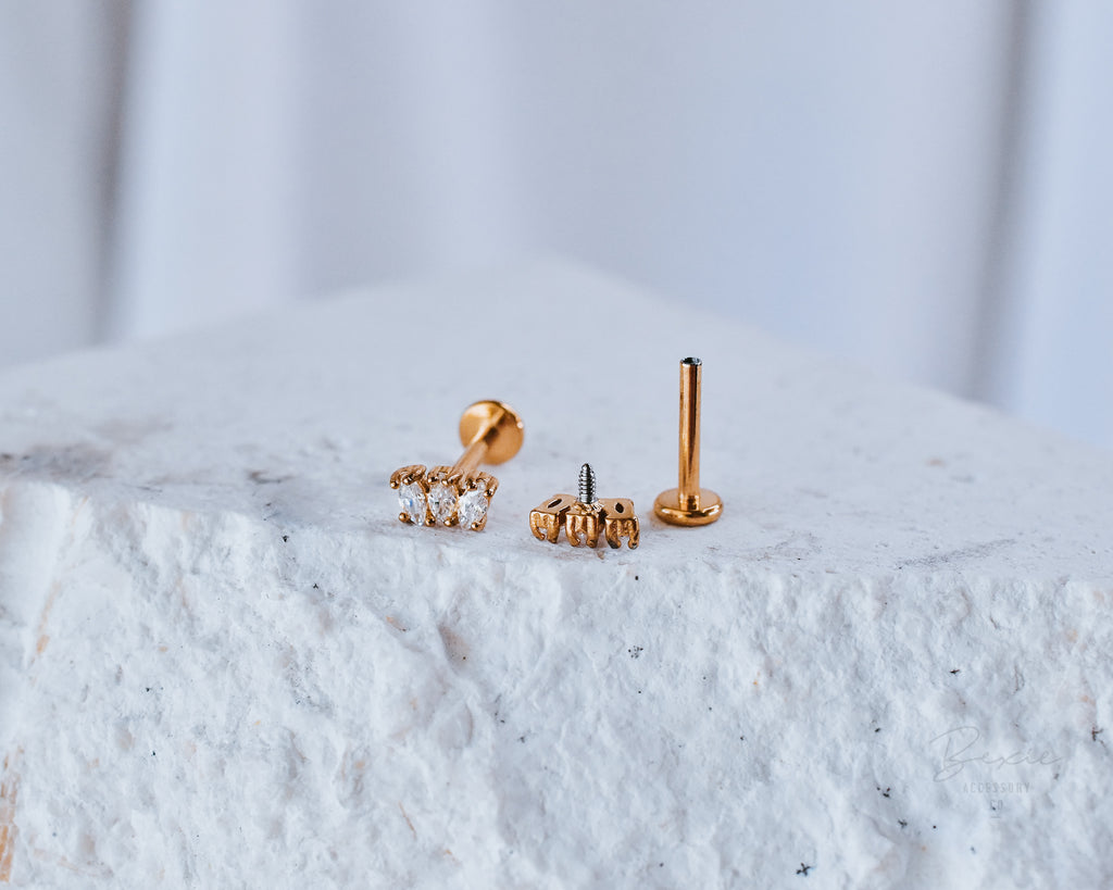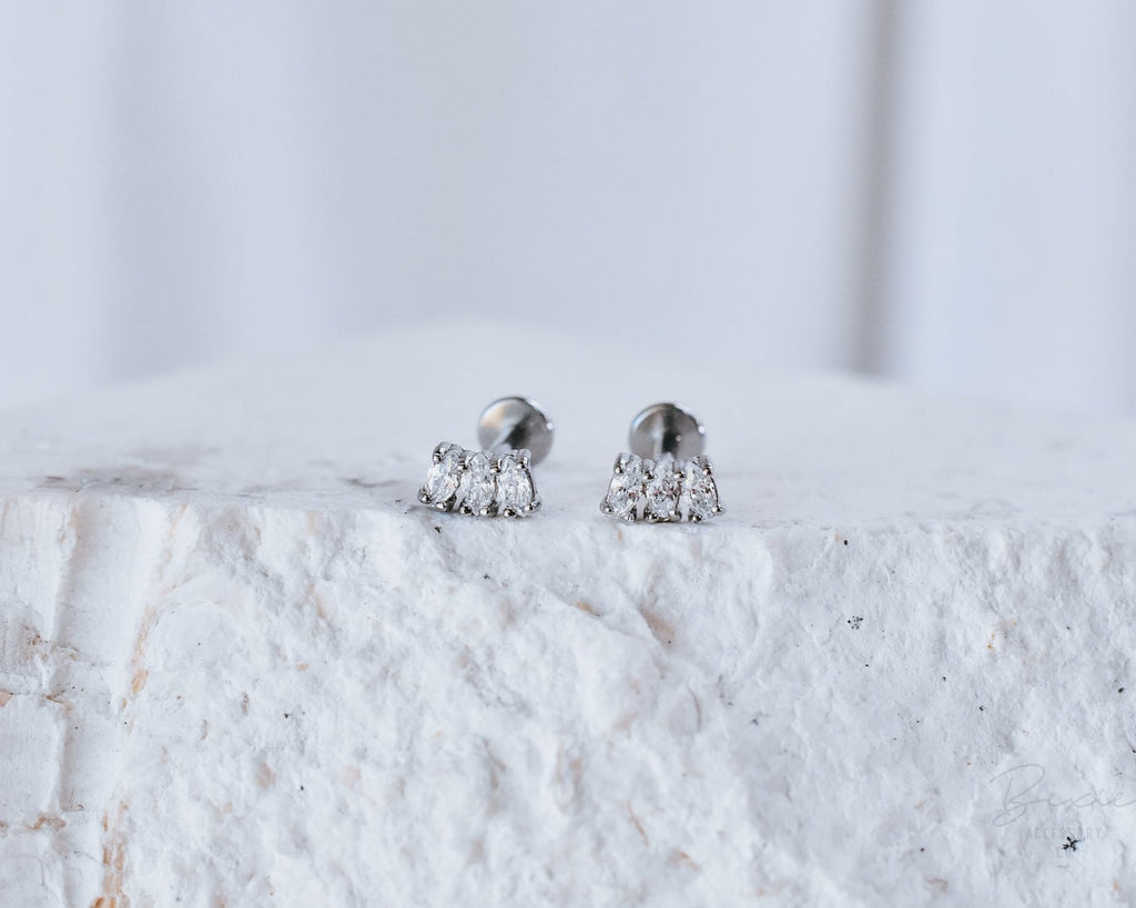 - Studded with 3 tiny marquise-cut clear zircon gemstones