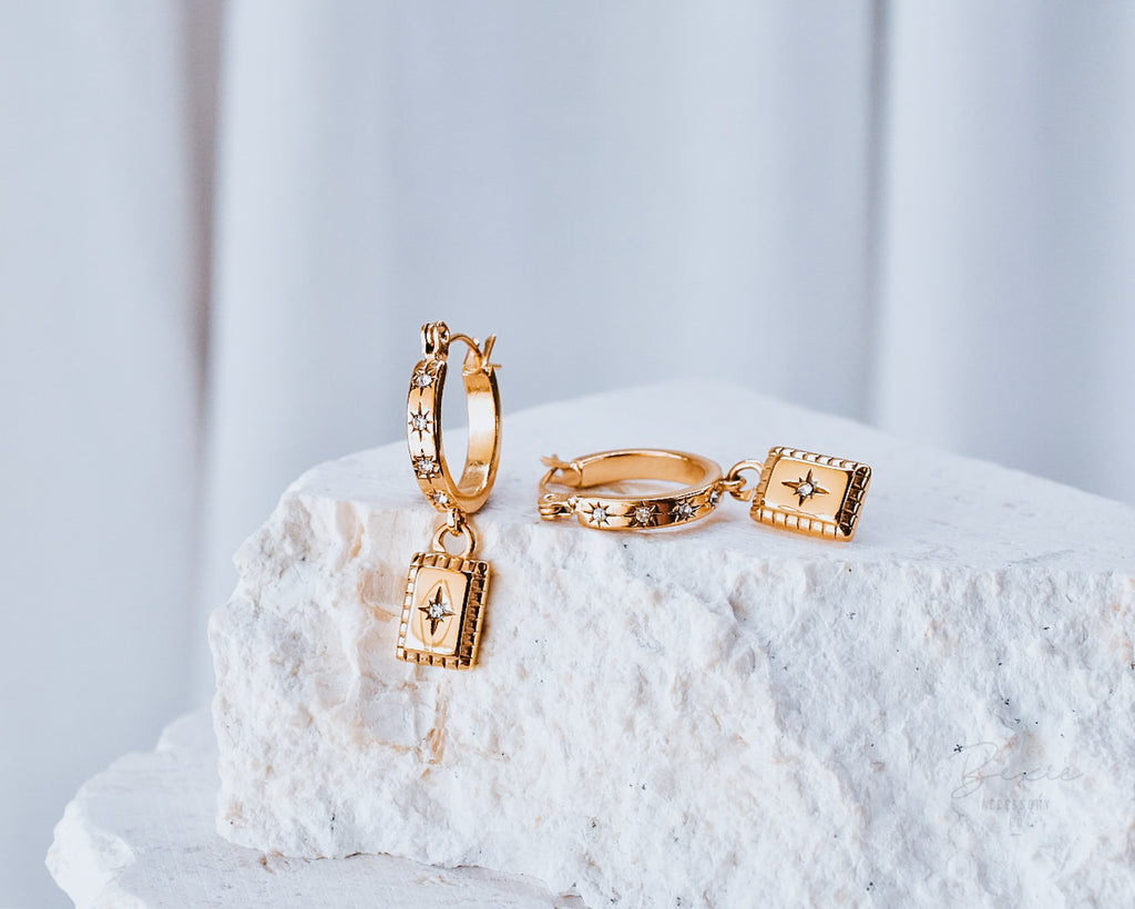 - Elegant zircon studded hoop + charm, with embossed star detail.