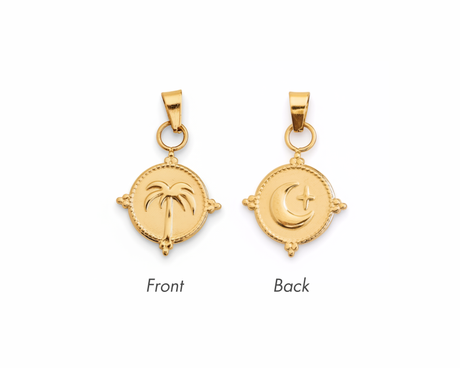The Cove reversible charms features a different design front and back (Palm tree on one side, Moon on the other side), meaning you can turn them around and wear them 3 different ways 🌙🌴 Charm sold individually, or build your charm necklace or bracelet here.