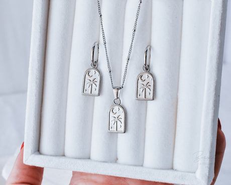 Our jewellery is crafted from surgical stainless steel, making it waterproof, tarnish proof and safe for sensitive skin. Gold jewellery is PVD plated in long-lasting 18k gold, while silver jewellery is highly polished surgical steel. (*Please note, our silver steel jewellery is naturally a darker tone than sterling silver, however, unlike sterling silver, it will not tarnish or darken further over time).